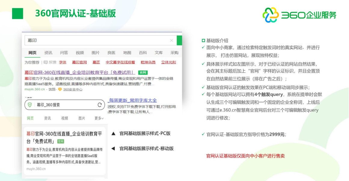 360官网认证是360搜索针对官方网站的特殊展示机制,通过官网认证标注后,您的网站会显示在有针对性的寻址需求自然结果的前列,特辨识性的加“官网”字样的标记。(1...