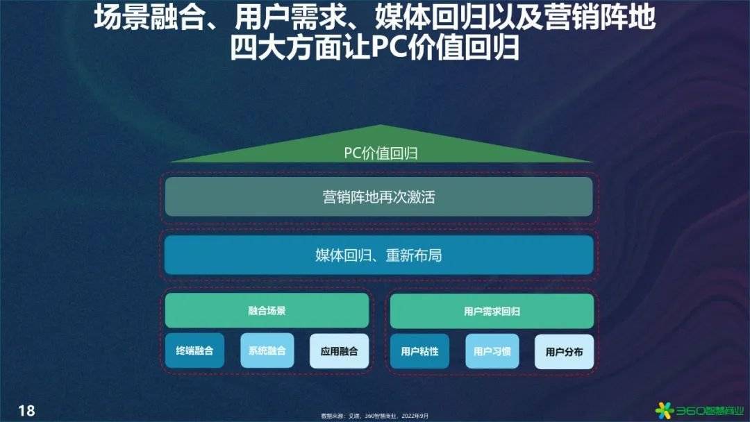 在经历了10年的迅猛发展后,移动互联网流量红利到顶已是不争的事实。进入存量时代,长期存在于移动和PC端的流量之争,也从割裂的此消彼长走向深度融合。PC价值被重提,不仅是基于疫情后PC出货量大增,也是进入“存量博弈”时代后各行业数字化所面临的必然趋势。聚焦融合场景、用户需求、行业布局、营销阵地四大维度,360智慧商业发布《2024年PC价值回归研究报告》(以下简称“报告”),解构PC价值回归,希望能给各行业从业者带来有价值的参考。