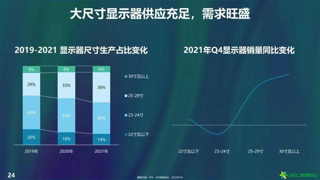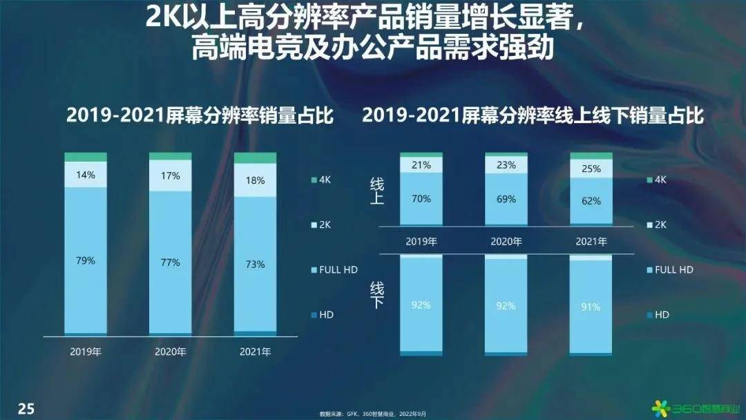 从“功能”到“智能”——终端迭代的过程,是以不断提升的人机交互能力以使设备成为人体“外部器官”使智能设备更好为人所用的过程。因此,更加的精巧、便携的外观和更加自然的交互成为大势所趋。而从最近的一些趋势来看,我们可以认为,即便轻巧设备可以带来“无感”般顺滑的自然交互,但在视觉体验上,用户对大视野所带来清晰度、沉浸感依然有强烈的需求——25寸以上大尺寸显示器生产占比及销量增速都有显著增长,与此同时,2K以上高分辨率屏幕销售表现也相当可观,其中以高端电竞及办公产品需求尤为强劲。